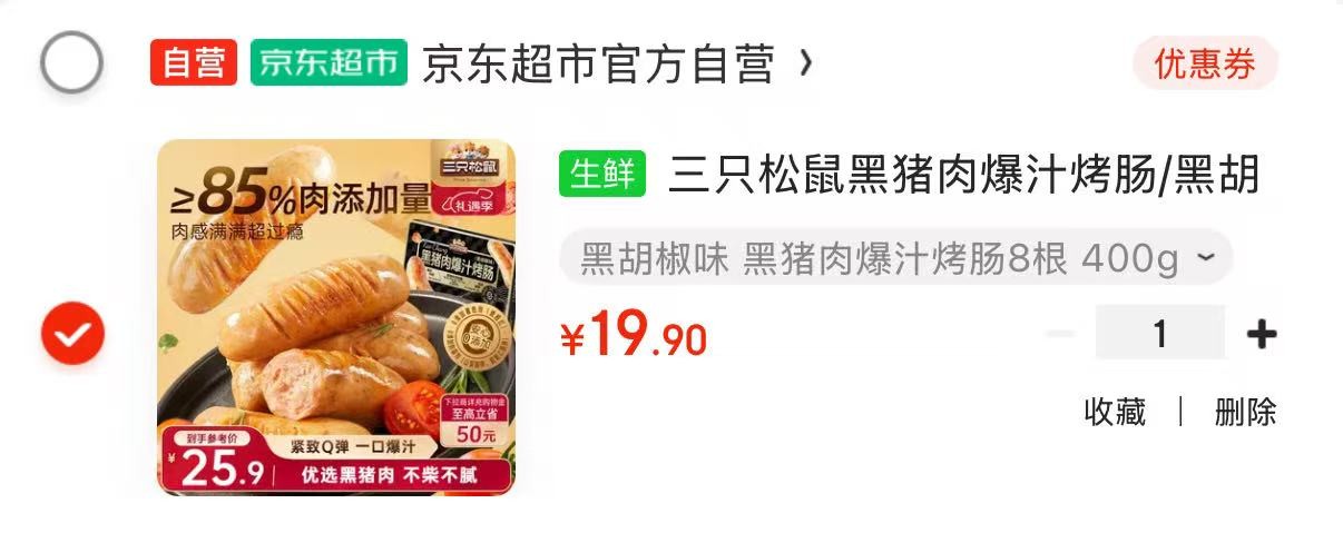 限武汉 南京地区 三只松鼠黑猪肉爆汁烤肠/黑胡椒味/400g【19.9】