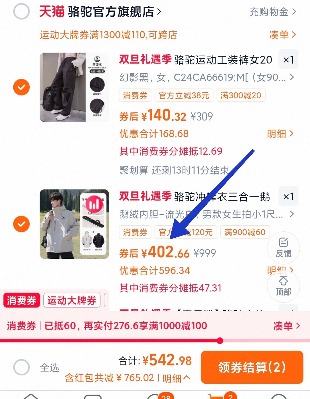 3.复制去绹宝 用裤子凑单1件 这步是凑1300-110运动劵好单发报员2025年12月25日 10:510举报 3.复制去绹宝 用裤子凑单1件这步是凑1300-110运动劵https://m.tb.cn/h.7fSeEON——一起下单之后单独退掉凑单骆驼鹅绒三合一冲锋衣390-400左右到手了!复制文案