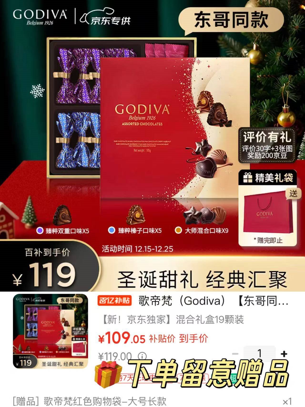 东哥同款安排 歌帝梵 经典巧克力19颗165g 119亓自营包邮,新客减4亓 好单发报员 2025年12月25日 12:53 0 举报 ——东哥同款安排——歌帝梵 经典巧克力19颗165ghttps://u.jd.com/AOGJC3v119亓自营包邮,新客减4亓*plus低至109亓 随单赠礼袋*5大风味 1盒尽收 囤上尝尝 复制文案