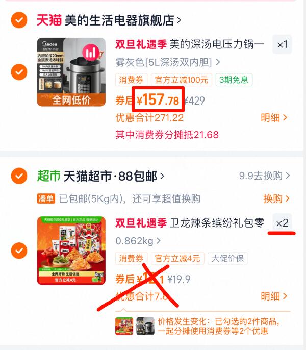 3、凑单商品加购2件 一起付款然后退掉凑单