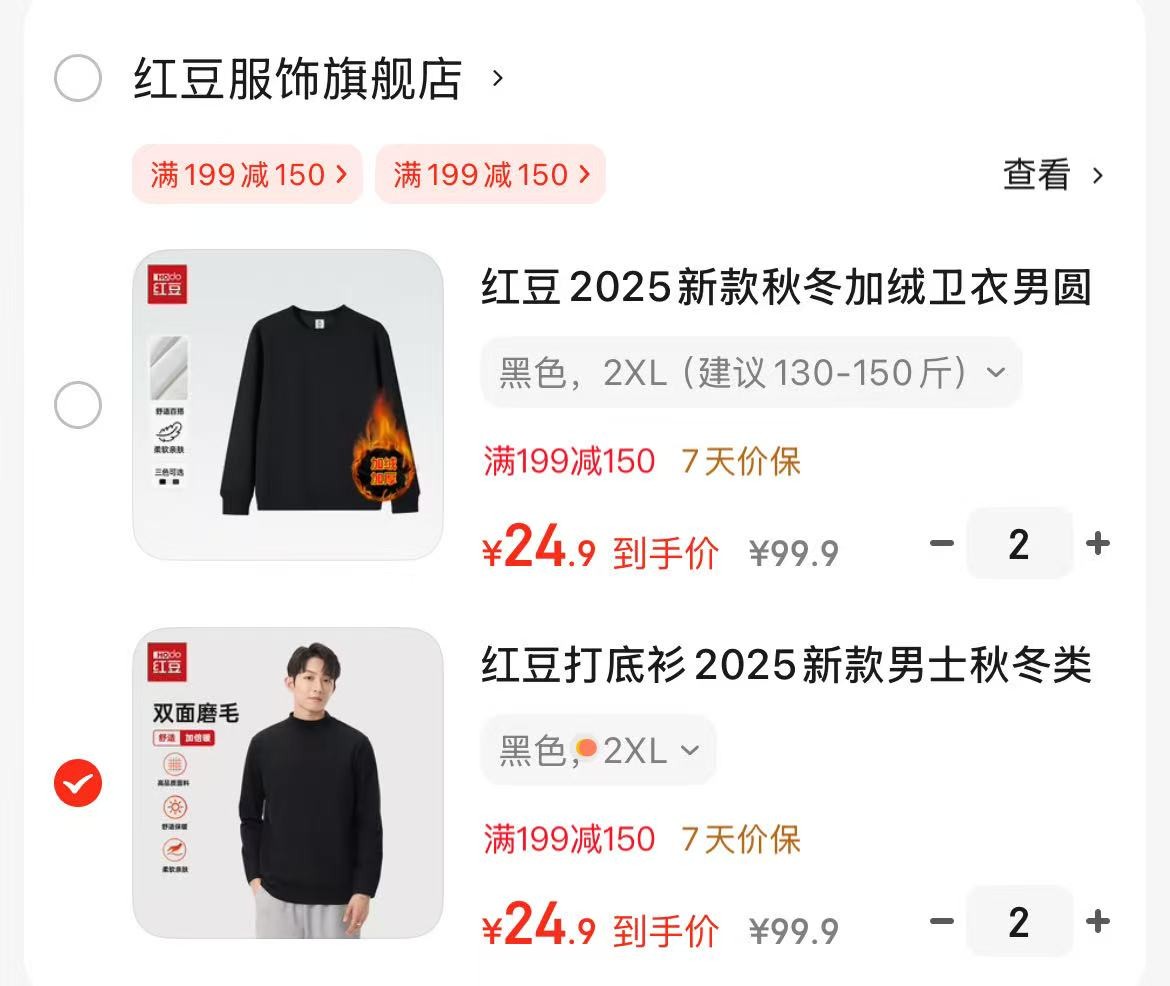 红豆 打底衫德绒加厚,任选2件【49.8】