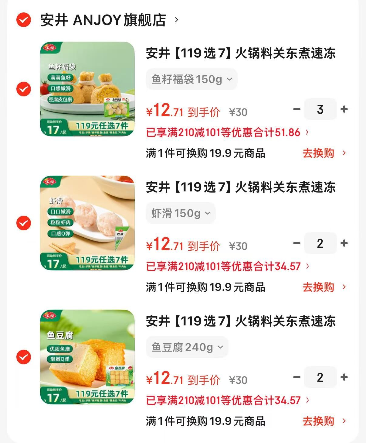 安井 火锅料关东煮速冻丸子 嫩鱼丸200g等,任选7件【89】