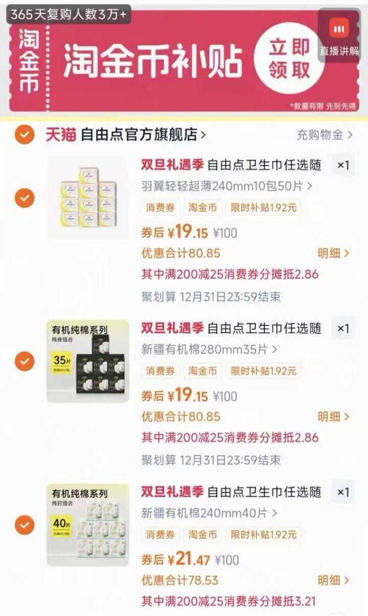 2.凑单商品 加车1件 先一起付款 再退凑单商品 自由点卫生巾组合 59.7元 好单发报员 2025年12月25日 21:46 0 举报 2.凑单商品 加车1件先一起付款 再退凑单商品https://m.tb.cn/h.75i2lOv自由点卫生巾组合 59.7元-赠350ml玻璃杯+柔纸巾3包每个月都要用的速度囤 复制文案