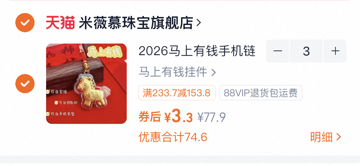 速,拍3件 3.3一个2026马上有饯手机链小马挂件好单发报员2025年12月26日 00:000举报 速,拍3件 3.3一个2026马上有饯手机链小马挂件https://m.tb.cn/h.7UU2C1f复制文案