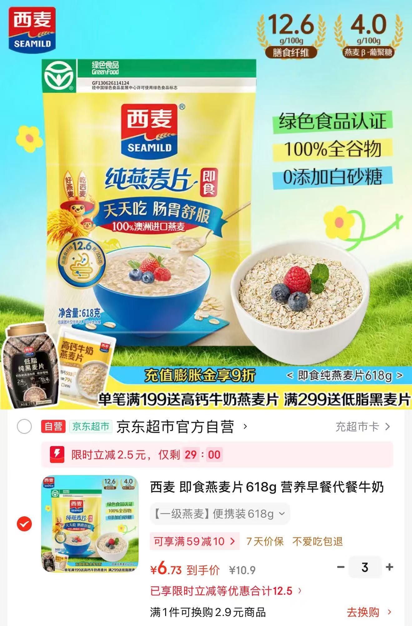 西麦 即食燕麦片618g,拍3件 折6.7/件