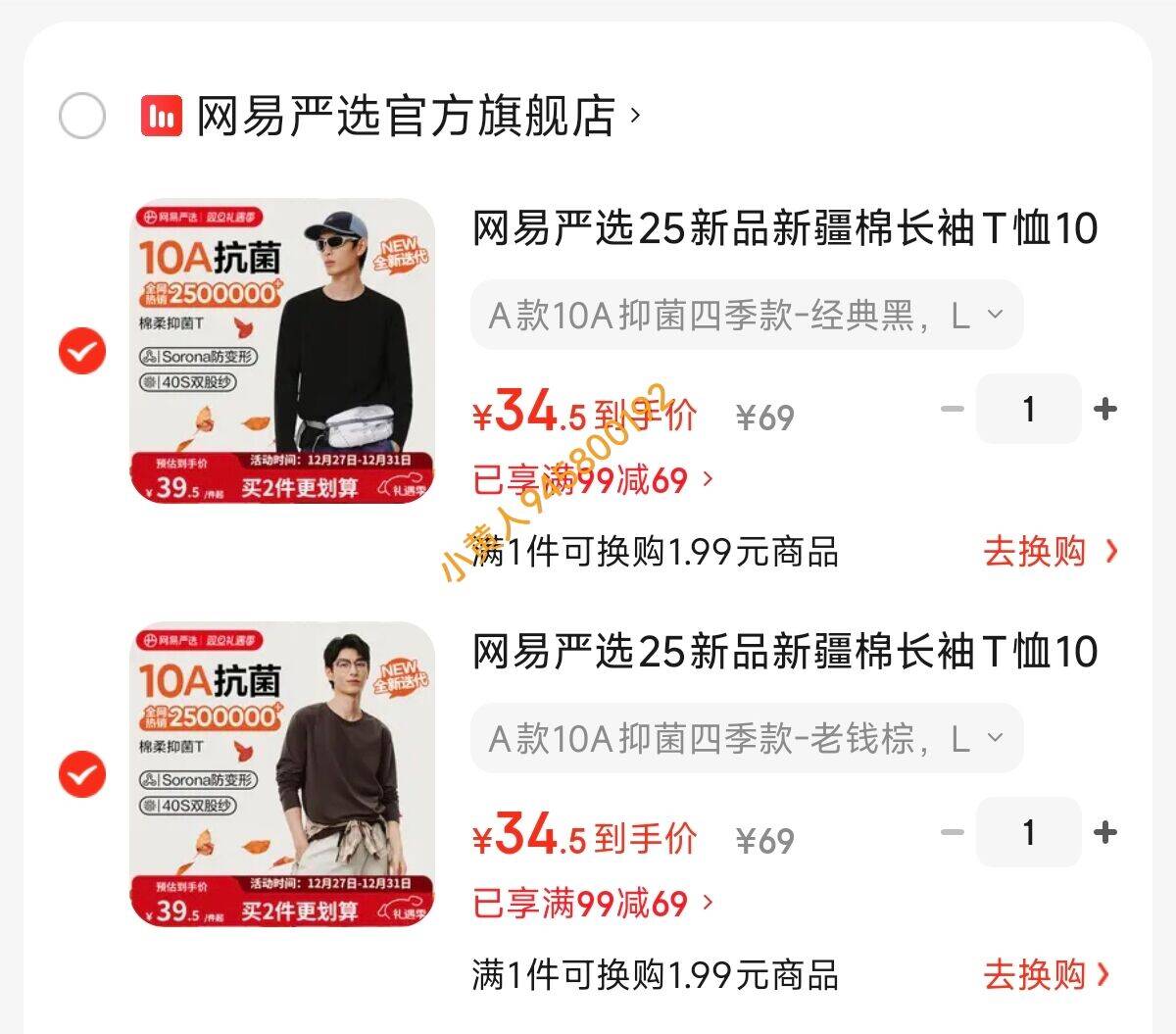 网易严选新疆棉长袖T恤,任选两件69 折34.5/件
