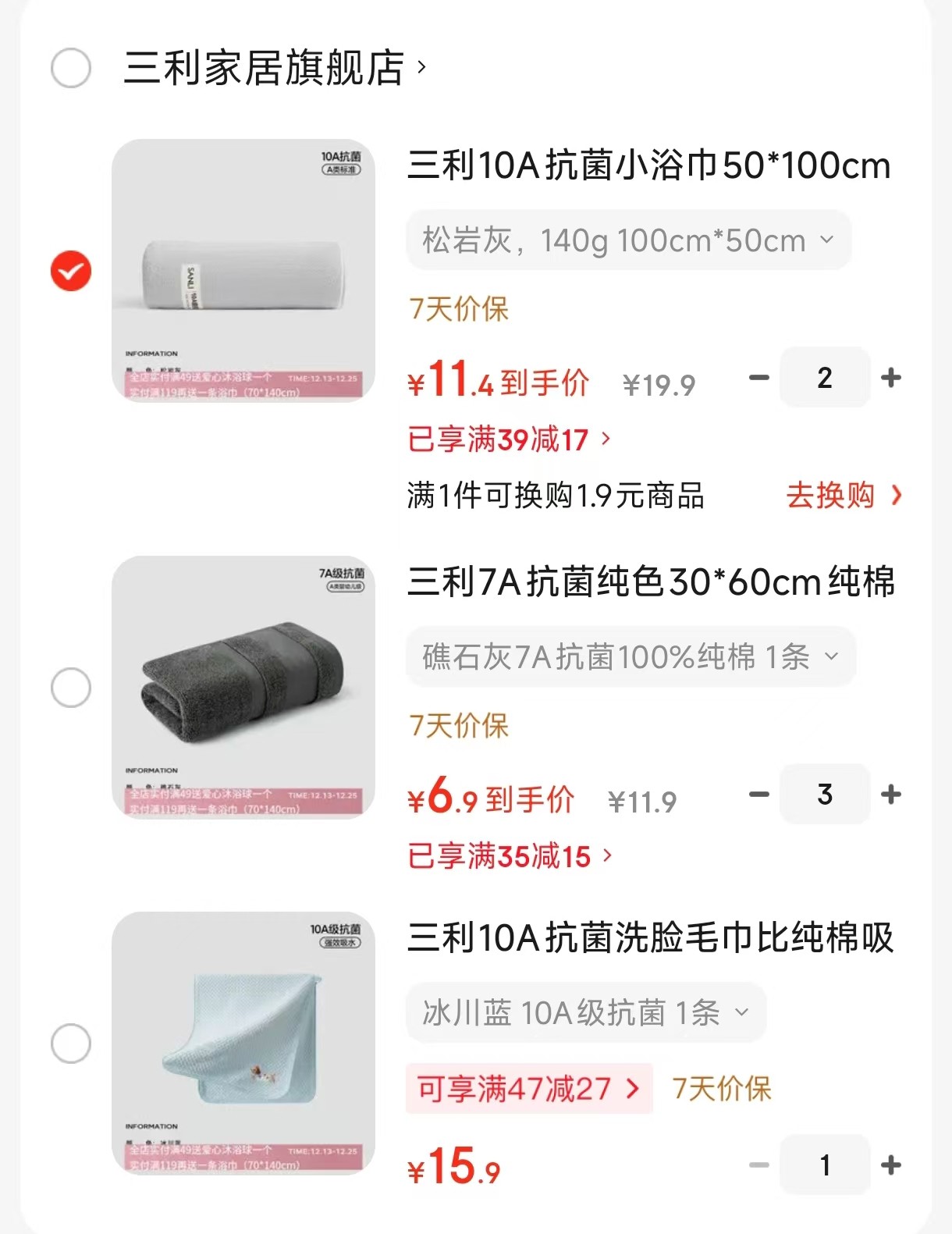 三利 10A抗菌毛巾,任选3件【20.7】https://u.jd.com/AGnuaij