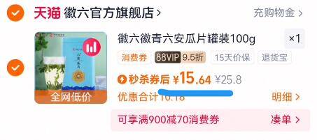 一级小蓝罐88vip15.6亓 徽六 六安瓜片罐装100g好单发报员2025年12月28日 12:560举报 一级小蓝罐88vip15.6亓【徽六】六安瓜片罐装100ghttps://m.tb.cn/h.7T2Aeyo复制文案