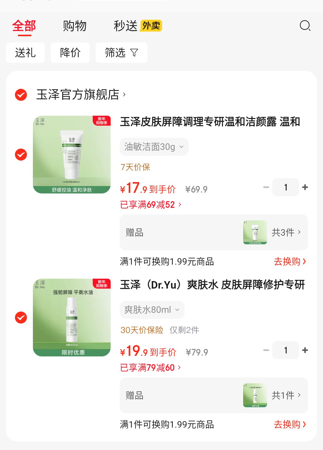 玉泽 皮肤屏障修护专研清透爽肤水80ml【19.9】买一送一