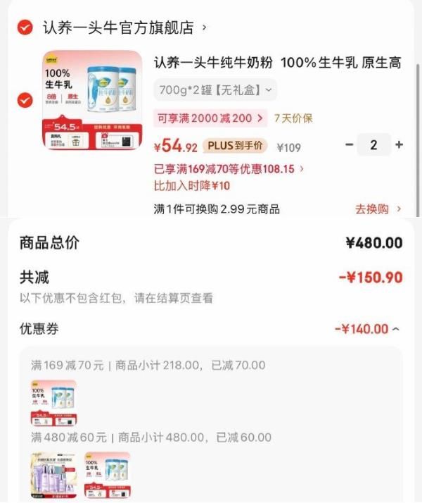 认养一头牛纯牛奶粉 700g*2罐无礼盒