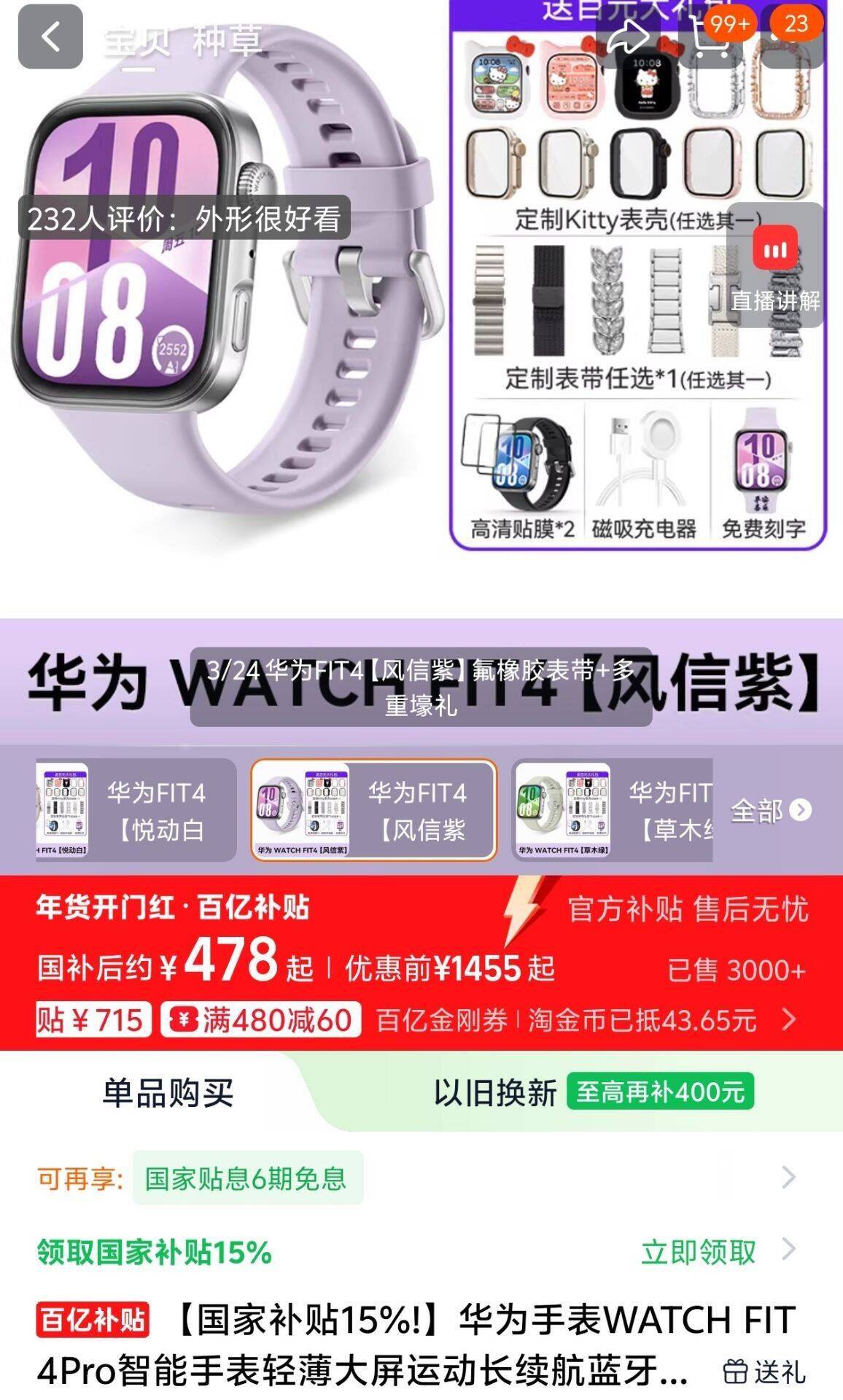华为FITE 4手表!部分地区!国卜后448元~478 需88vip480-60消费卷成立!! ①领9折金刚卷,全玲!!