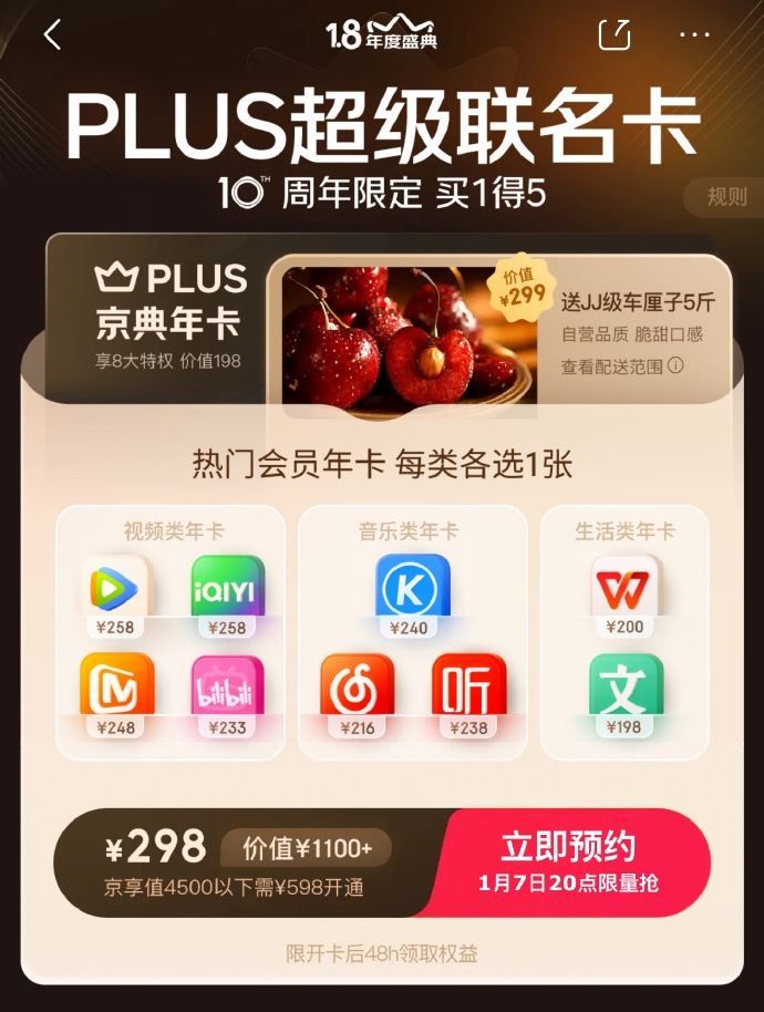 7号20点 plus超级联名卡,298元 10周年限定,买1得5: plus京典年卡