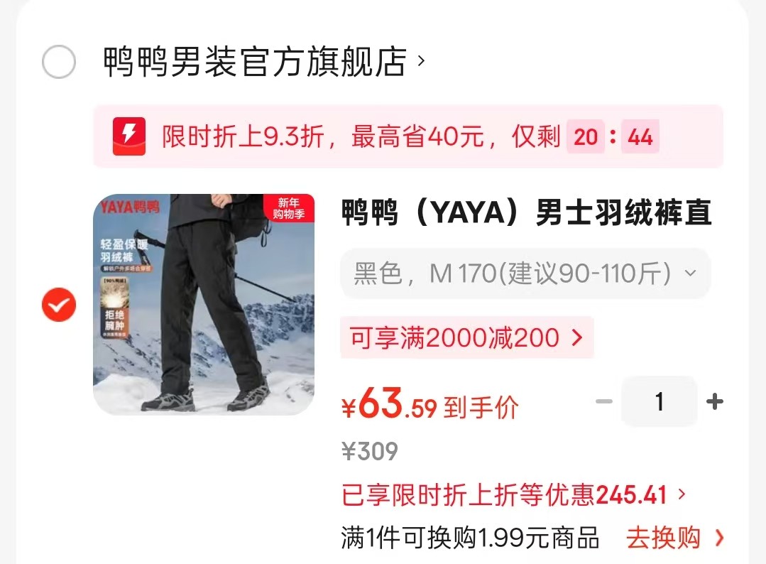 plus领480-60: 领100-22 鸭鸭 男士羽绒裤直筒加厚,凑后 63.5