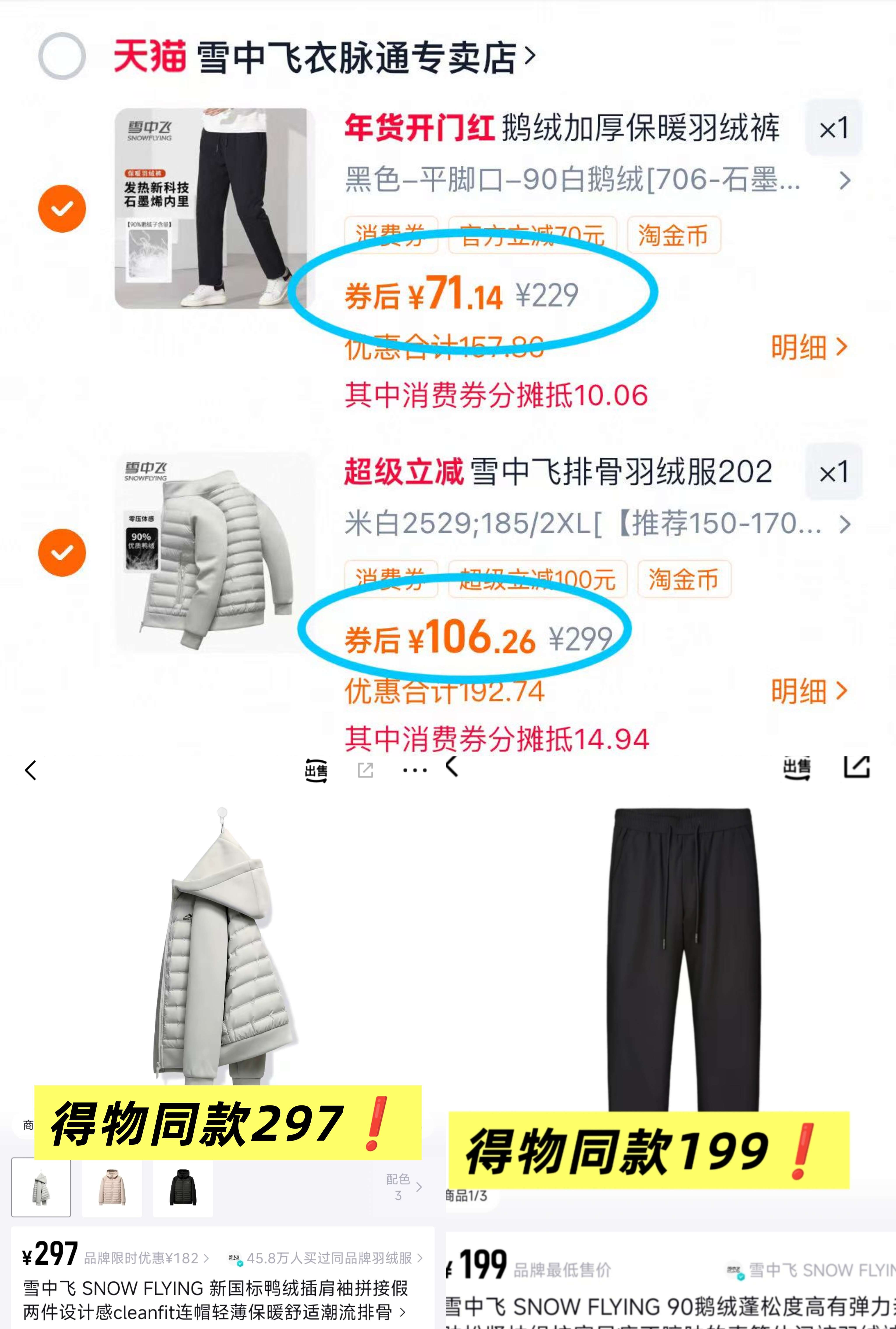 雪中飞 排骨白鸭绒服106元