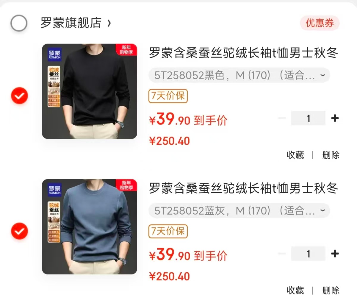 罗蒙 含桑蚕丝驼绒长袖t恤,任选2件【79.8】