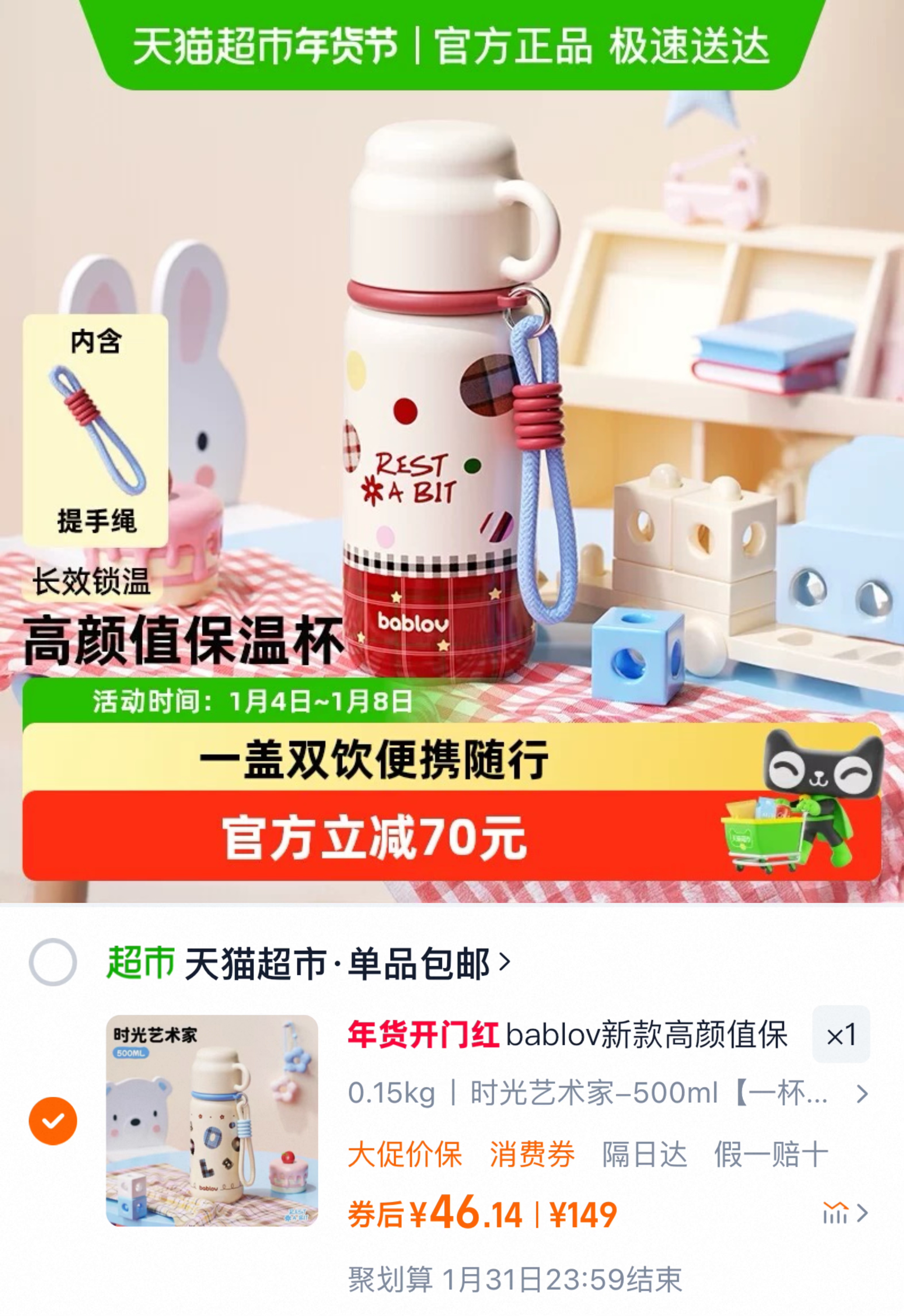 Bablov新款保温杯500ml,淘金币频道加购,凑单199-20品类券和200-25消费券,88vip付46元!