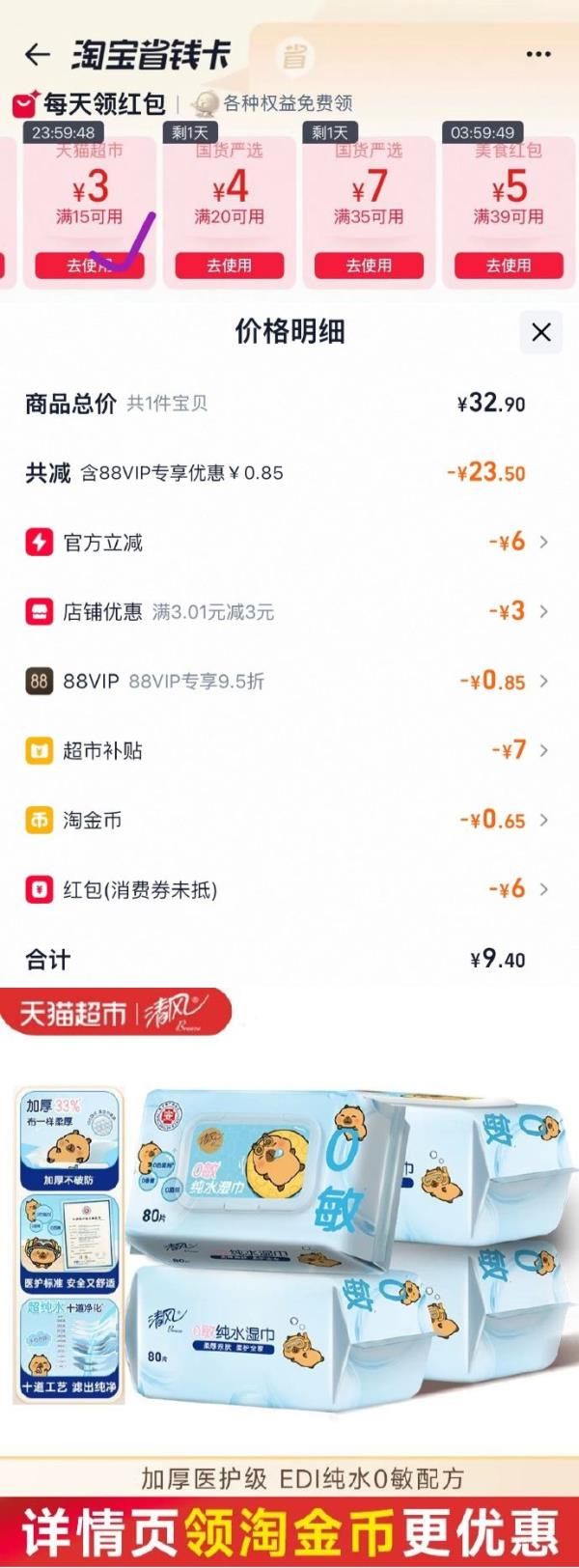 (如没有3红包,淘金币页面下单9.77)