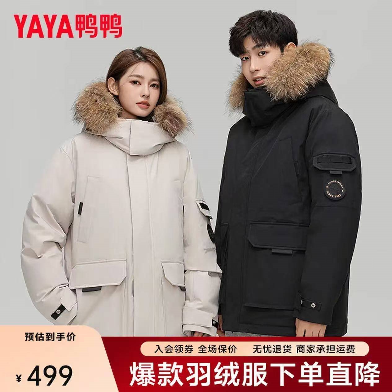 鸭鸭 男女大毛领连帽羽绒服