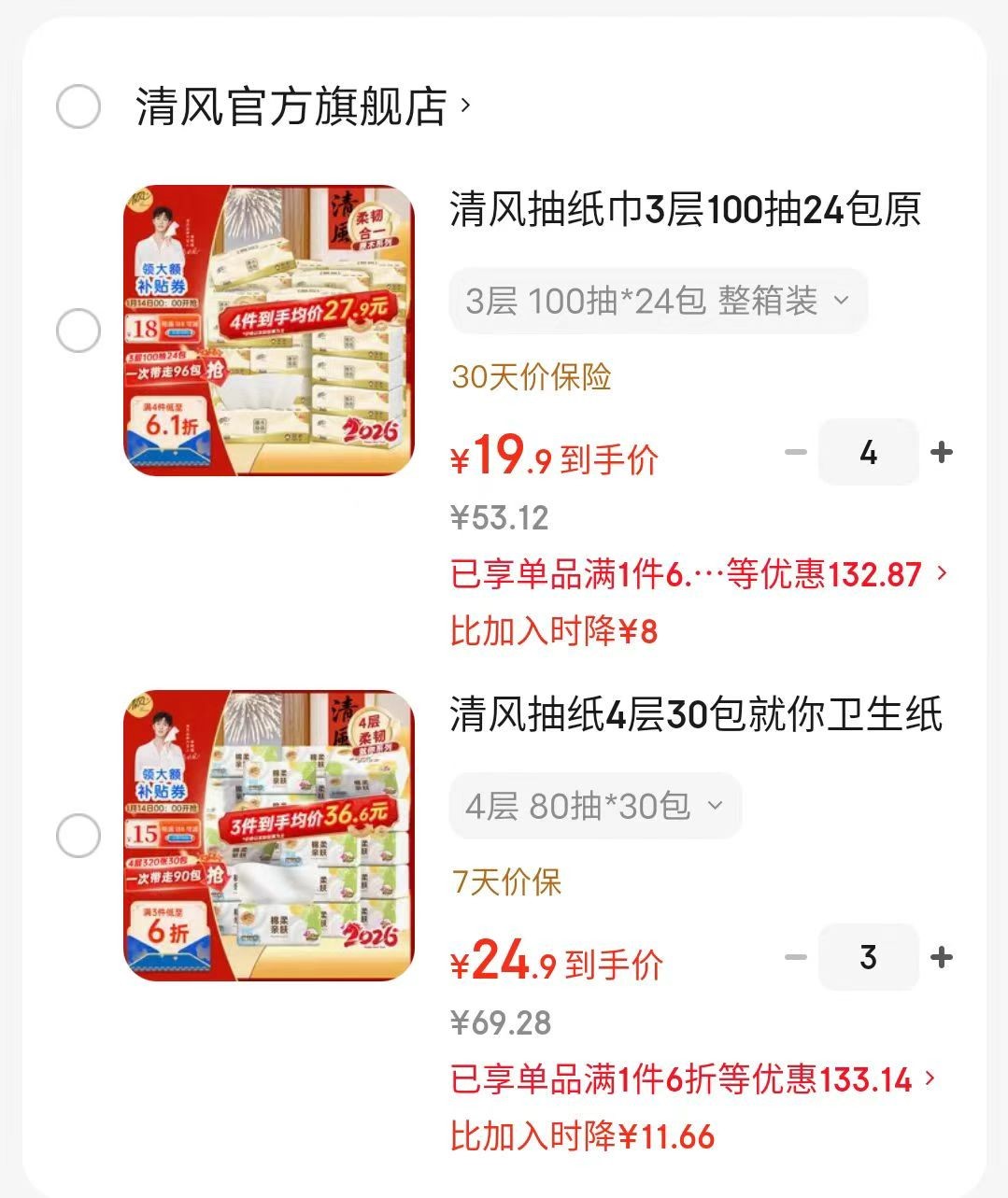 清风 抽纸4层80抽*30包,买3折单件24.9【0.83/包】