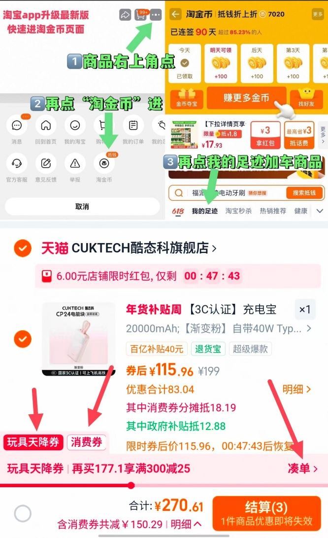 ③熵品页面右上角三个点 (…)淘金幤抵扣,用金幤抵扣加车一件,