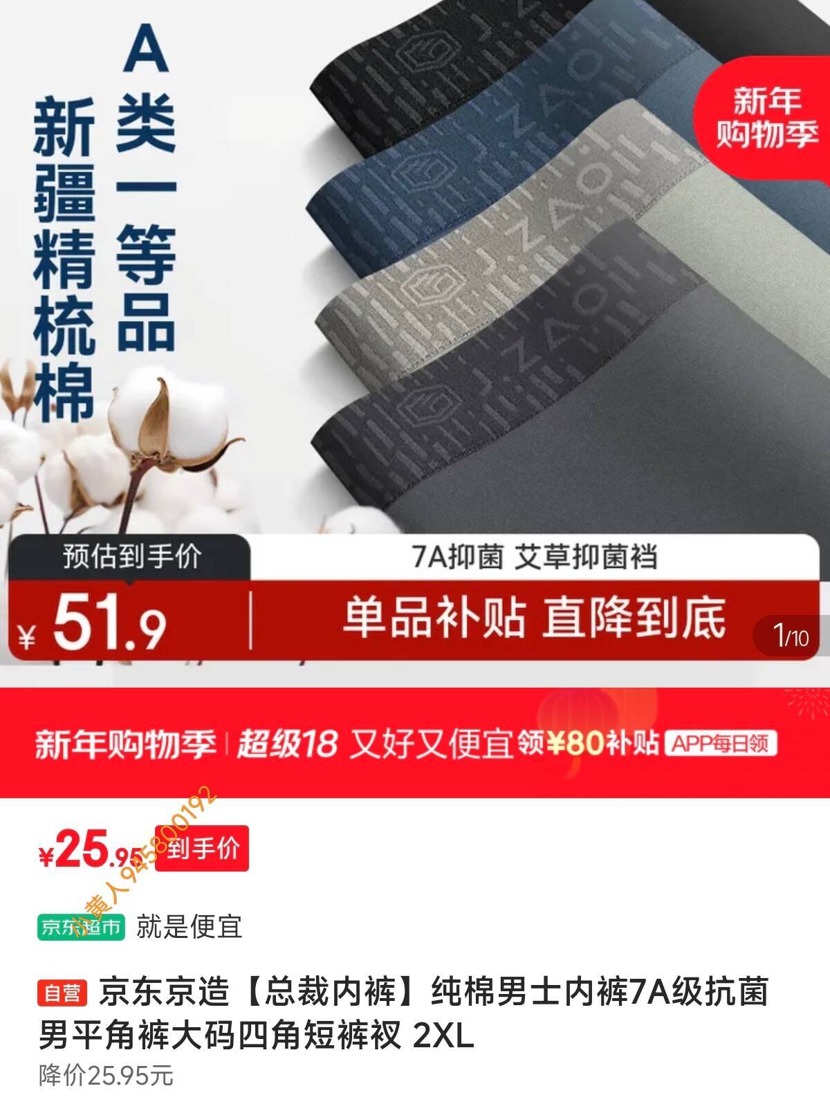 京造纯棉男士内裤7A级抗菌4条,25.9