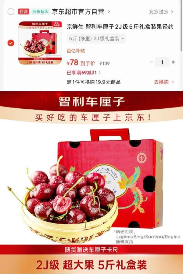 京鲜生 智利车厘子2J级5斤礼盒装果径约28-30mm