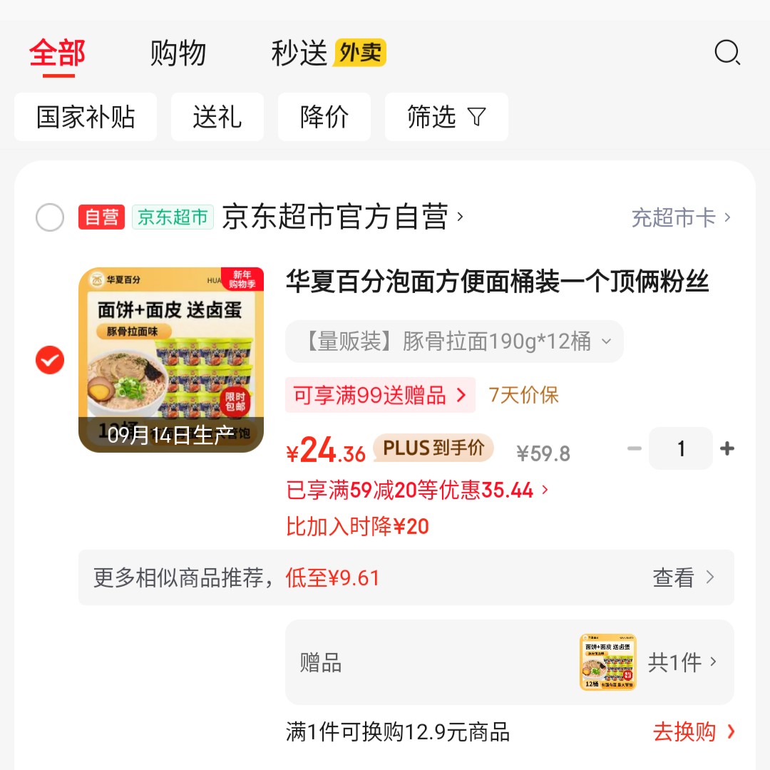 华夏百分 泡面 豚骨拉面190g*12桶装,凑后【24】买一送一