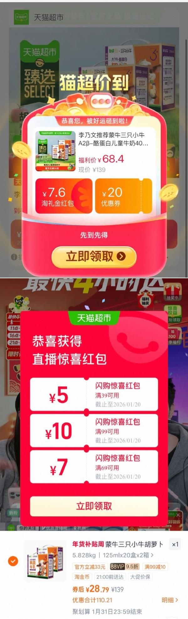 超市直播间右上角-惊喜权益,部分有39-5红包