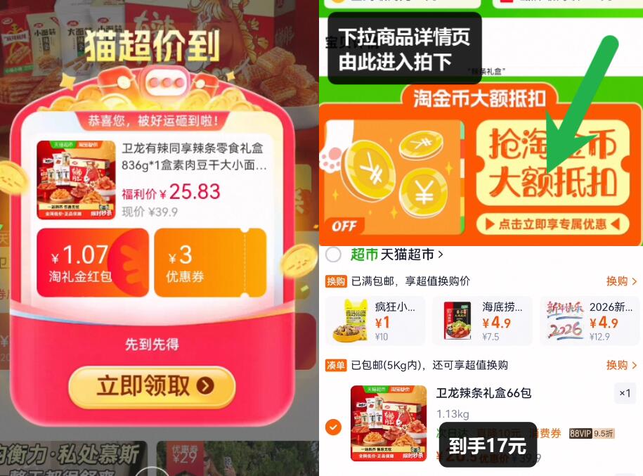 88vip17亓速限时礼金 叠3.9亓金币 楼上3品牌金 下拉详情页去淘金币会场拍下 好单发报员 2026年01月19日 21:54 0 举报 88vip17亓速限时礼金叠3.9亓金币 楼上3品牌金下拉详情页去淘金币会场拍下【卫龙】有辣同享零食礼盒836ghttps://m.tb.cn/h.7NZR0G5 复制文案