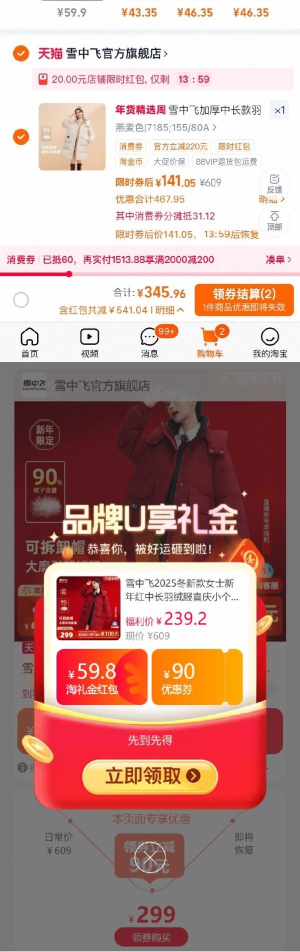 雪中飞 女士中长款羽绒服 ,弹窗大额补贴,限时20元无门槛红包,入会65券,淘金币足迹加购
