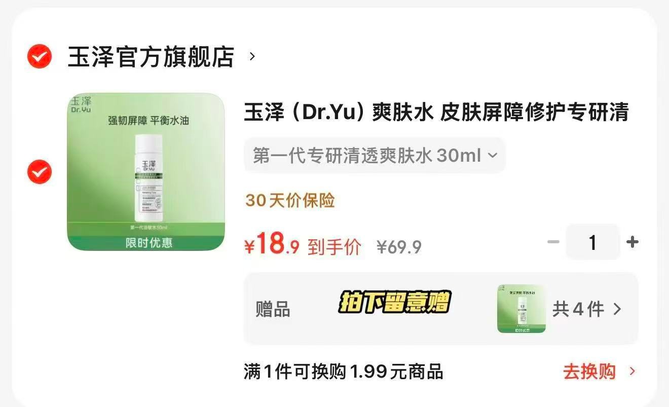 注意赠品 有赠品再提交 玉泽 皮肤屏障修护保湿水30ml 18.9 买一送4 共5瓶 玉泽 皮肤屏障调理专研清透洁面乳30g 17.9 买一送3 共4支