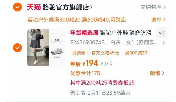 骆驼清岩登山鞋运动鞋194元 - 需叠88的200-25消费券好单发报员2026年01月21日 10:520举报 骆驼清岩登山鞋运动鞋194元-需叠88的200-25消费券还需叠楼上300-20户外券https://m.tb.cn/h.7n4tcLo复制文案
