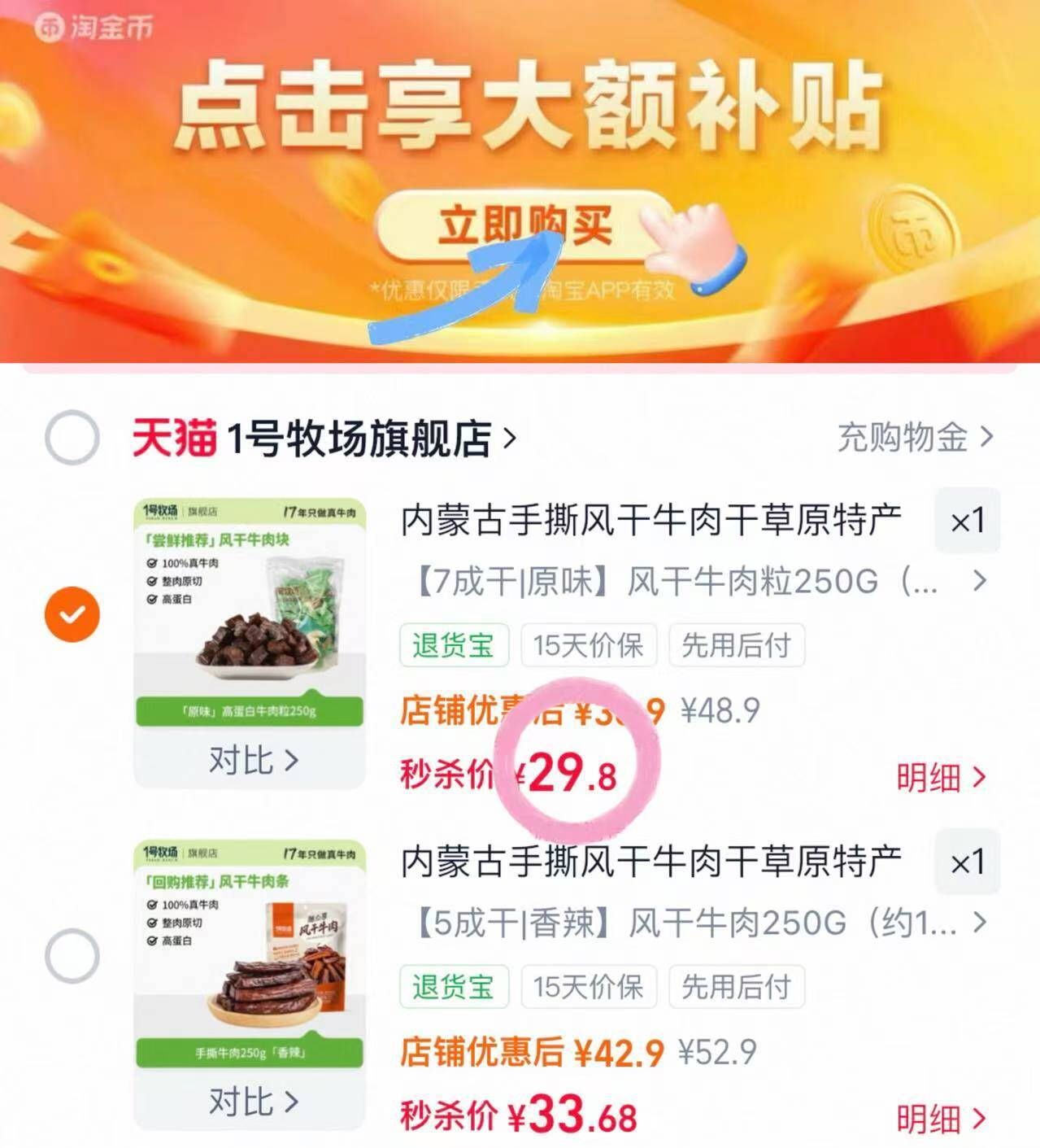 29元1号牧场风干牛肉250g - 如图下拉详情页抵扣惍币 好单发报员 2026年01月21日 14:29 0 举报 29元1号牧场风干牛肉250g-如图下拉详情页抵扣惍币牛肉块跟牛肉干都有,这个好吃https://m.tb.cn/h.7MJttKJ 复制文案