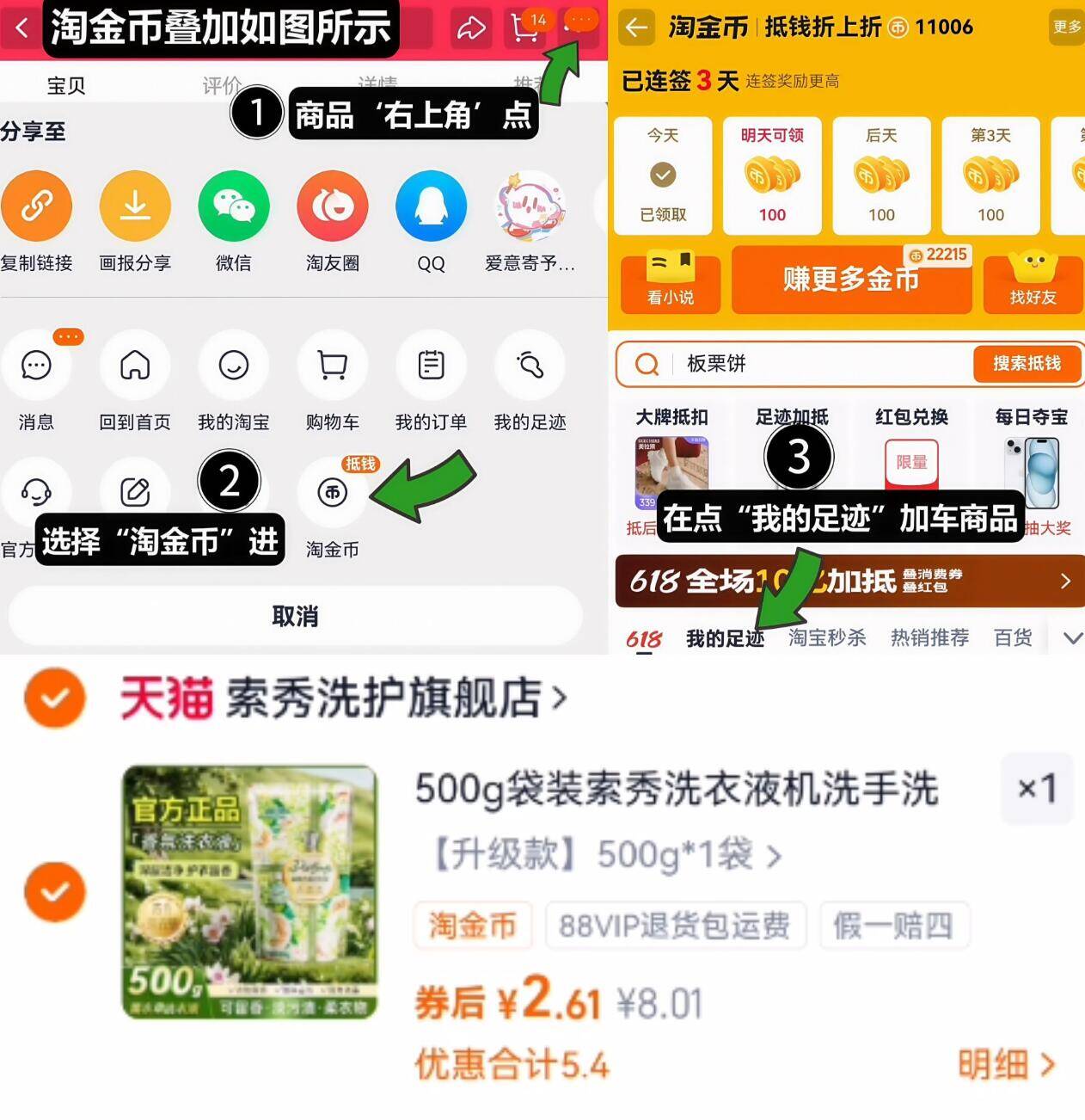 2.6亓速按步骤拍 索秀 香氛洗衣液500g 1、如图点右上角3个点,选淘金币 好单发报员 2026年01月21日 23:19 0 举报 2.6亓速按步骤拍【索秀】香氛洗衣液500g1、如图点右上角3个点,选淘金币2、选我的足迹-找到商品加车拍下https://m.tb.cn/h.7M1KW5t 复制文案