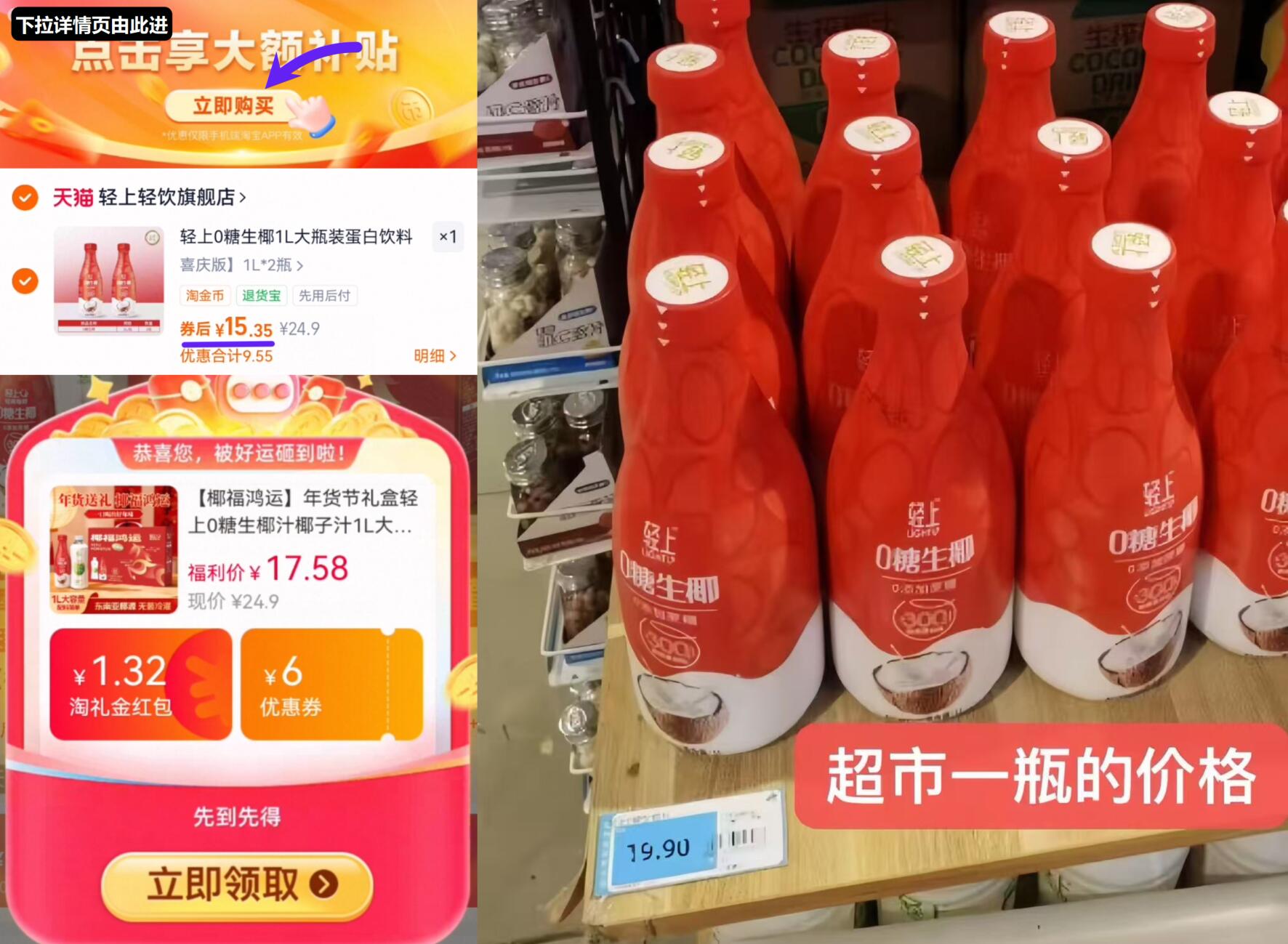 7.6亓/瓶神圿叠限时礼金 拍下15.3亓,拍前4个选项 领礼金下拉详情跳转淘金币拍好单发报员2026年01月22日 10:050举报 7.6亓/瓶神圿叠限时礼金拍下15.3亓,拍前4个选项领礼金下拉详情跳转淘金币拍【轻上】0糖生椰椰汁椰子汁1L*2瓶https://m.tb.cn/h.7o6C5cx线下1瓶20亓!饭店超市都是这牌子复制文案