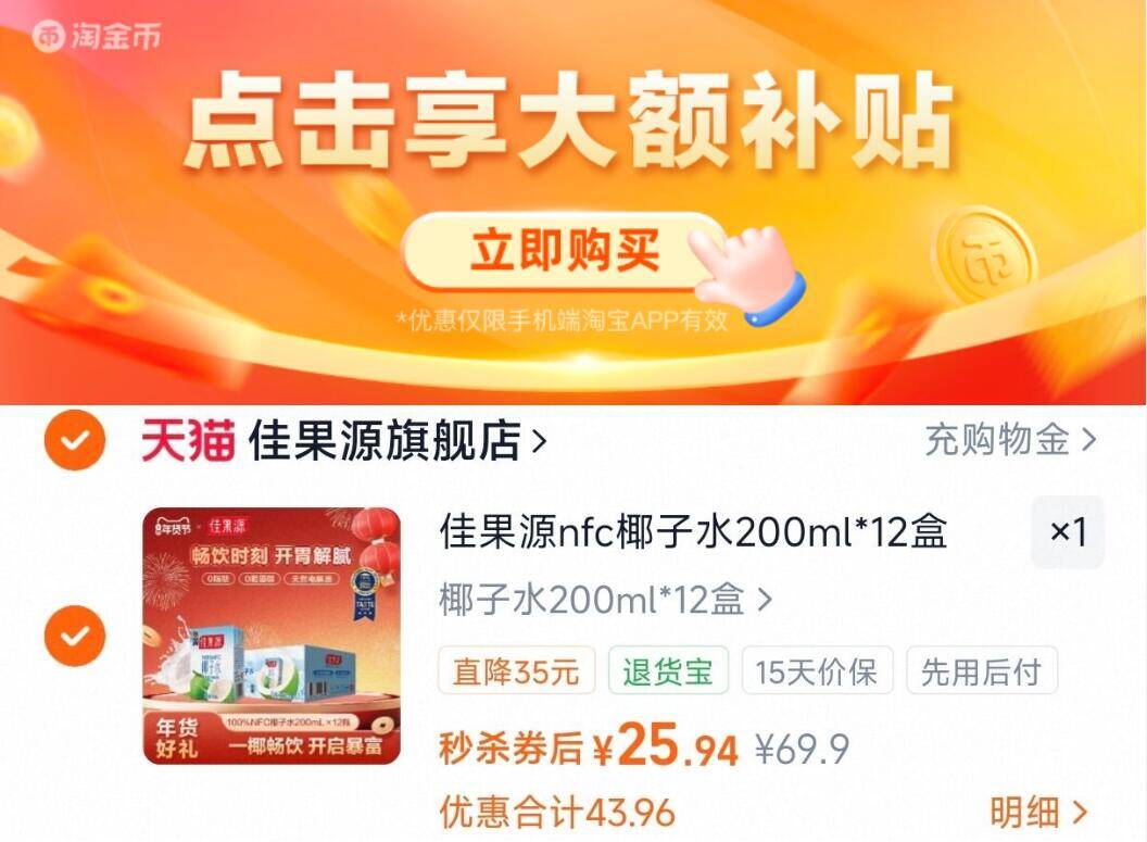 下拉详情拍,25.9亓 佳果源佳农100%NFC椰子水200ml*12盒好单发报员2026年01月22日 11:260举报 下拉详情拍,25.9亓佳果源佳农100%NFC椰子水200ml*12盒https://m.tb.cn/h.7Mc36D6复制文案