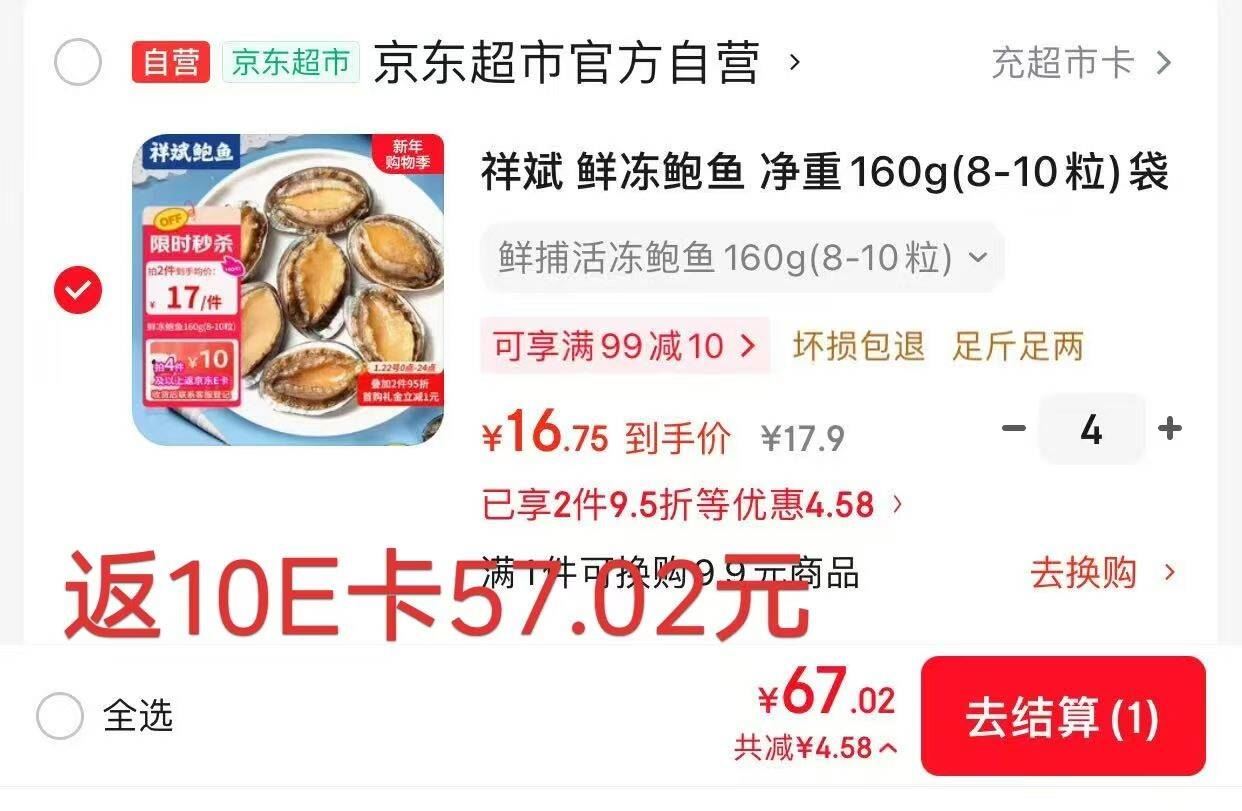 1.4元/个 自营鲍鱼! 自营 祥斌 鲜冻鲍鱼 净重160g8-10粒 拍4件返10卡后57.02元!速度啦!好单发报员2026年01月22日 11:510举报 1.4元/个 自营鲍鱼!【自营】祥斌 鲜冻鲍鱼 净重160g8-10粒https://u.jd.com/Eaxmje4 拍4件返10卡后57.02元!速度啦!复制文案
