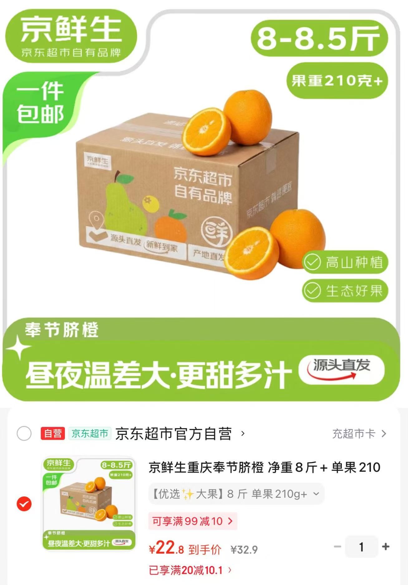 京鲜生 重庆奉节脐橙 8-8.5斤 果重210克 【22.9】