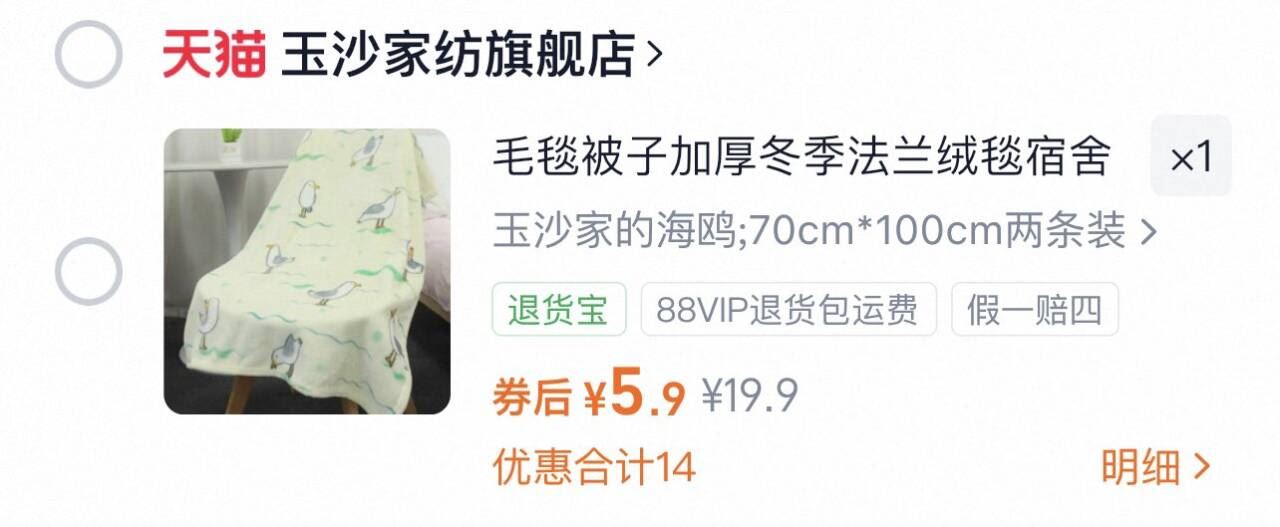 5.9亓 2.9亓/条 空调毯午睡毯70cm*100cm*2条好单发报员2026年01月22日 18:560举报 5.9亓 2.9亓/条空调毯午睡毯70cm*100cm*2条https://m.tb.cn/h.7nEAus9复制文案