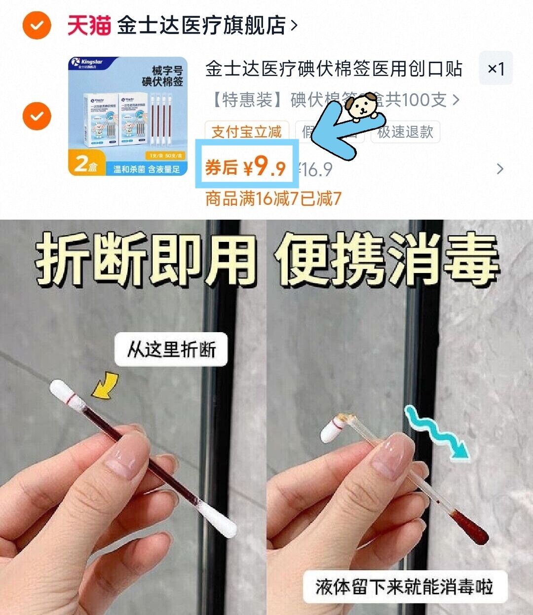 9.9亓大人小孩都能用 日常必备,小伤口快速处理! ---好单发报员2026年01月23日 11:290举报 9.9亓大人小孩都能用日常必备,小伤口快速处理!---金士达碘伏棉签共2盒100支https://m.tb.cn/h.7L4Qhi9械字号医用,安全可靠选择复制文案