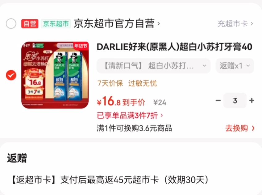 折0.9亓/支bug锁! 拍3件50.4亓!饭45超市卡 DARLIE好来超白小苏打牙膏40g*2好单发报员2026年01月23日 12:130举报 折0.9亓/支bug锁!拍3件50.4亓!饭45超市卡DARLIE好来超白小苏打牙膏40g*2https://u.jd.com/E1oGZI0复制文案