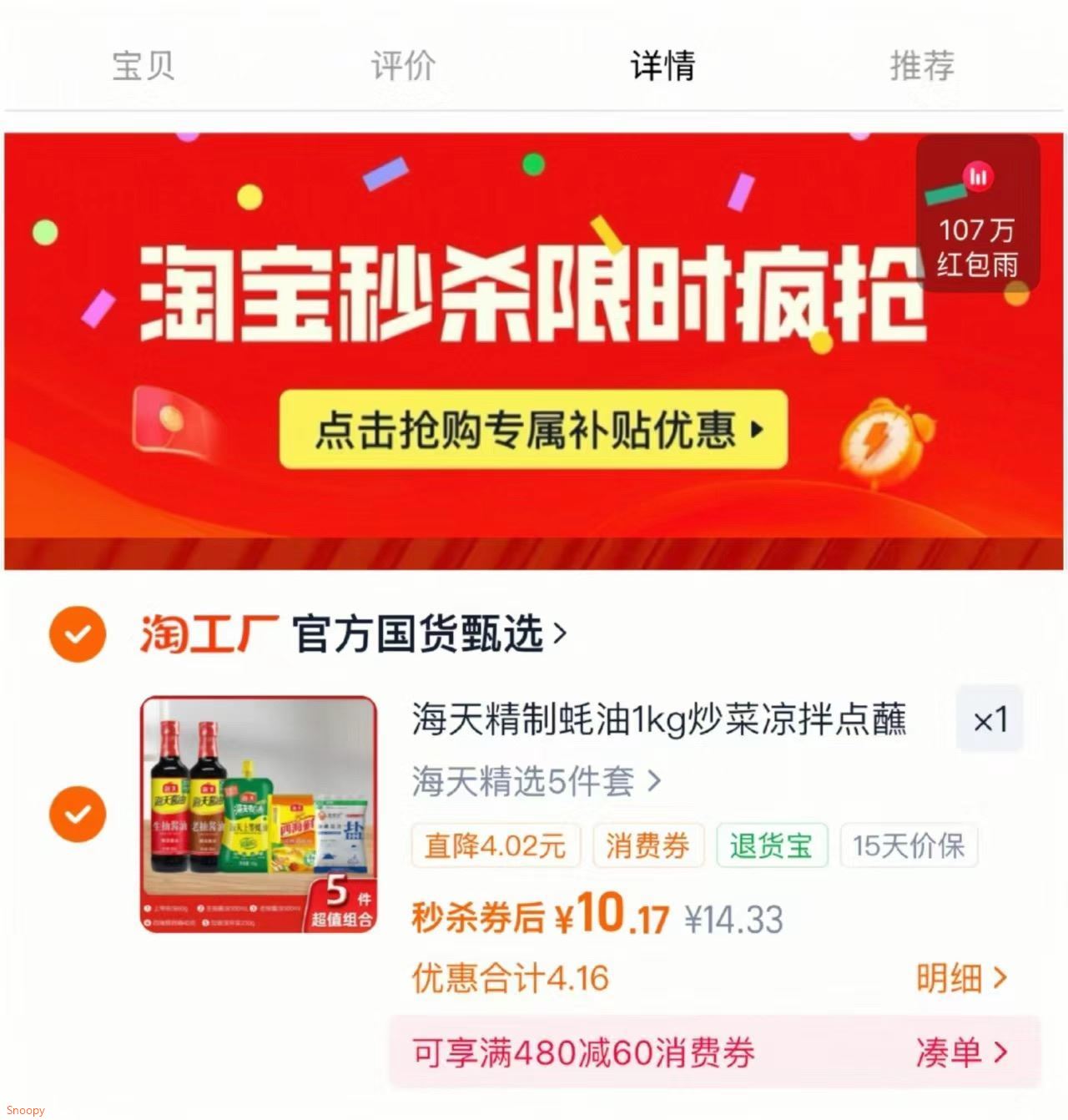 海天调料组合5件套 生抽 老抽 蚝油 鸡精 盐 下拉详情秒刹拍!10元.1好单发报员2026年01月23日 15:110举报 海天调料组合5件套生抽 老抽 蚝油 鸡精 盐下拉详情秒刹拍!10元.1超市一瓶生抽都八九块了快过年了做菜多,先备上-https://m.tb.cn/h.7MlF73b复制文案