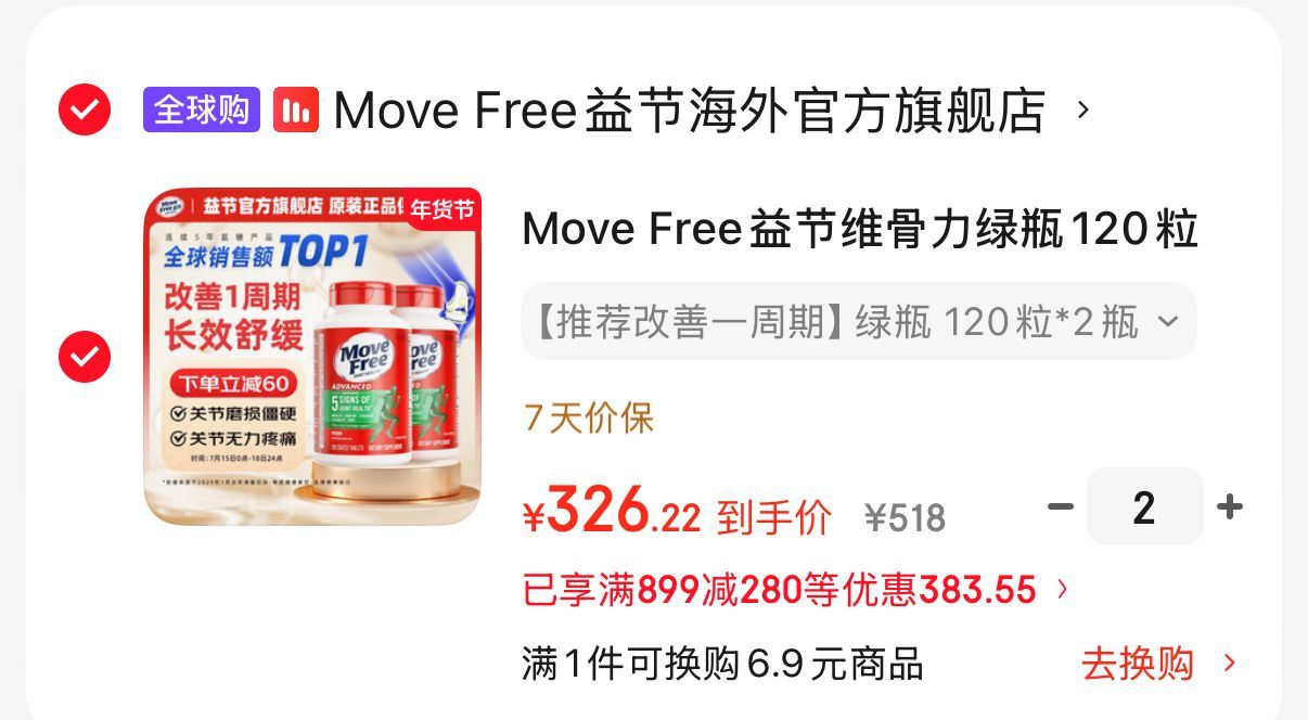 自营 益节氨糖绿瓶120粒*2瓶