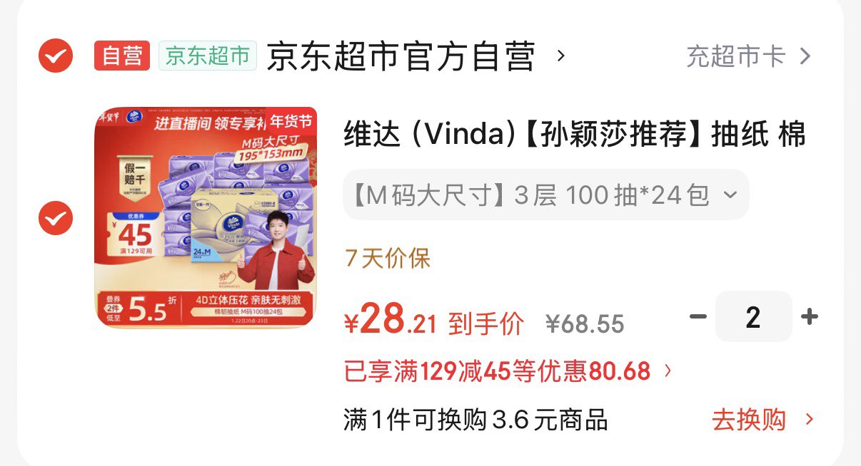 维达棉韧抽纸 100抽*24包M码