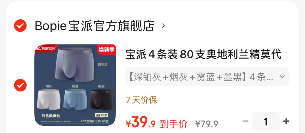 宝派 80支奥地利兰精莫代尔蚕丝裆男士导汗7A抗菌内裤 4条装【39.9】