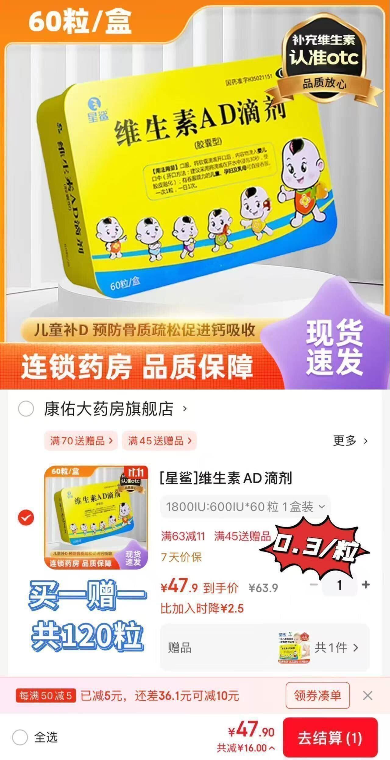 0.39元粒!拍1赠1共2盒47.9元! 星鲨 维生素AD滴剂60粒 到手共120粒 OTC版本药房发货 好价可囤好单发报员2026年01月23日 21:520举报 0.39元粒!拍1赠1共2盒47.9元!星鲨 维生素AD滴剂60粒https://u.jd.com/Ermh3ZO 到手共120粒 OTC版本药房发货 好价可囤复制文案