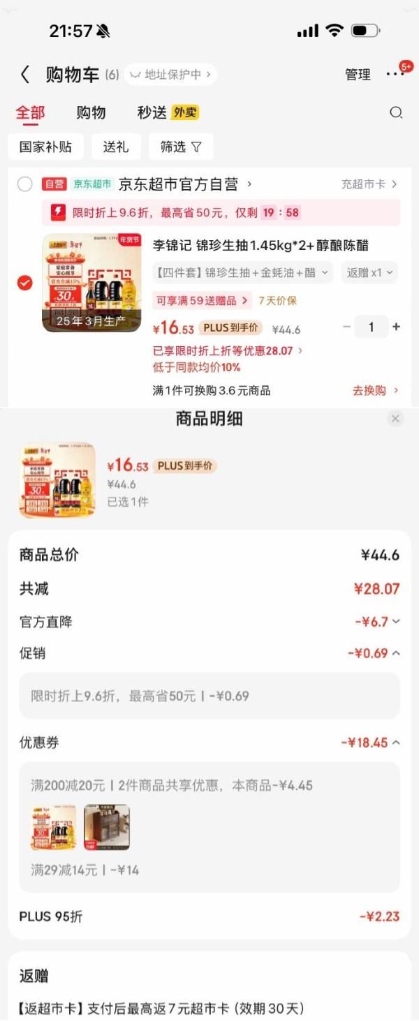 李锦记 锦珍生抽1.45kg*2 醇酿陈醋500ml 金蚝油550g临期 产品效期到26年9月