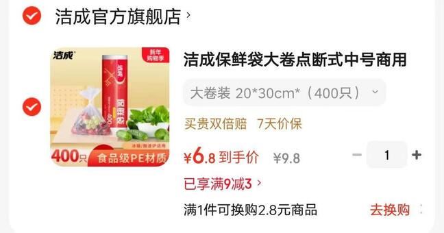 6.8元包邮! 洁成 保鲜袋大卷装 30cm*20cm*400只 点断式 加厚材质不易破~好单发报员2026年02月11日 22:270举报 6.8元包邮!洁成 保鲜袋大卷装 30cm*20cm*400只https://u.jd.com/lr6eJ5A 点断式 加厚材质不易破~复制文案