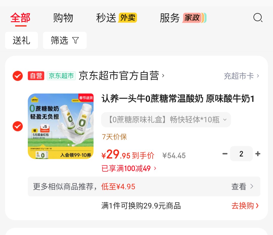 认养一头牛 0蔗糖常温酸奶 原味酸牛奶180g*10瓶装礼盒,拍2件【59】