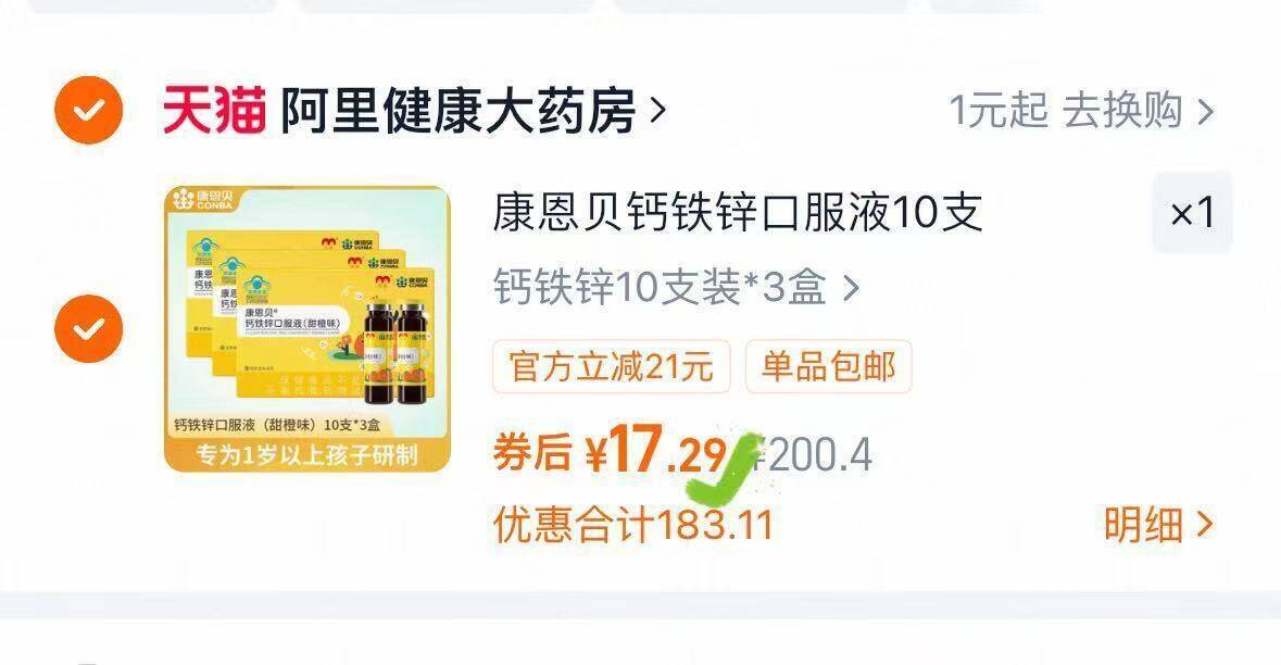 速度17.4 康恩贝钙铁锌口服10支*3盒
